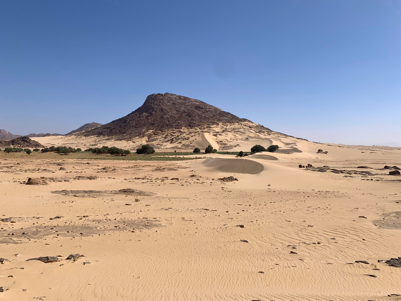 Ce matin, nous découvrons les oasis de Ouhet, havres de verdure qui contrastent avec les paysages minéraux que nous traversons l’après-midi. En fin de journée, nous retrouvons notre campement au pied de deux imposants blocs rocheux plantés dans le sable : les Jumeaux. Le ciel s’embrase d’étoiles et nous profitons de cette atmosphère paisible, réchauffés par les flammes du feu de camp.