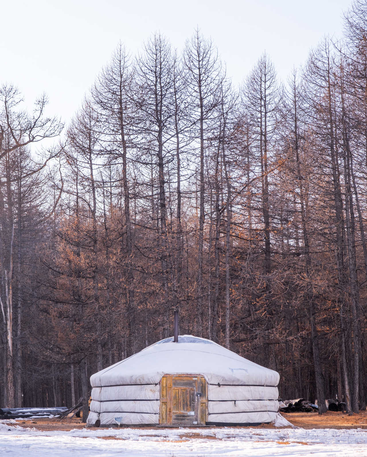 Nous poursuivons notre marche sur glace jusqu'au village de Jigleeg. Ici, plusieurs cabanes de bois sont installées non loin du lac, principalement habitées en hiver. Le lieu possède une vue imprenable sur le lac et sur la grande île appelée "Mondon Khuu" qui signifie "le fils du bois". Dans ce secteur vivent, avant la transhumance, de nombreuses familles nomades blotties entre les montagnes et le lac. Elles passent tout l'hiver ici en attendant le bon moment (avant que la glace ne dégèle) pour repartir dans la vallée dépression de Darkhad de l'autre côté du massif du Khoridol Saridag. Ce soir, nous retrouvons notre famille de nomades avec laquelle nous allons effectuer la transhumance de yaks, moutons et chèvres.