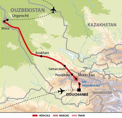 De manière générale, vous arrivez tôt le matin ou dans la nuit. Après du repos et un petit-déjeuner à l'hôtel, vous partez avec votre guide pour la visite de la ville. Vous visitez les jardins présidentiels et appréciez les statues des poètes Rudaki et d'Ismaïl Samani, père de la dynastie samanide. À cette époque, les cultures perses des Tadjikistan, Ouzbékistan, Iran, Afghanistan et Pakistan étaient unifiées. La ville n'est pas sans rappeler Saint Petersbourg du fait de l'aspect pastel des édifices néoclassiques. Vous passez par le grand marché central et déjeunez avant de découvrir l'une des plus belles et agréables capitales d'Asie centrale qui se situe à 850m d'altitude.